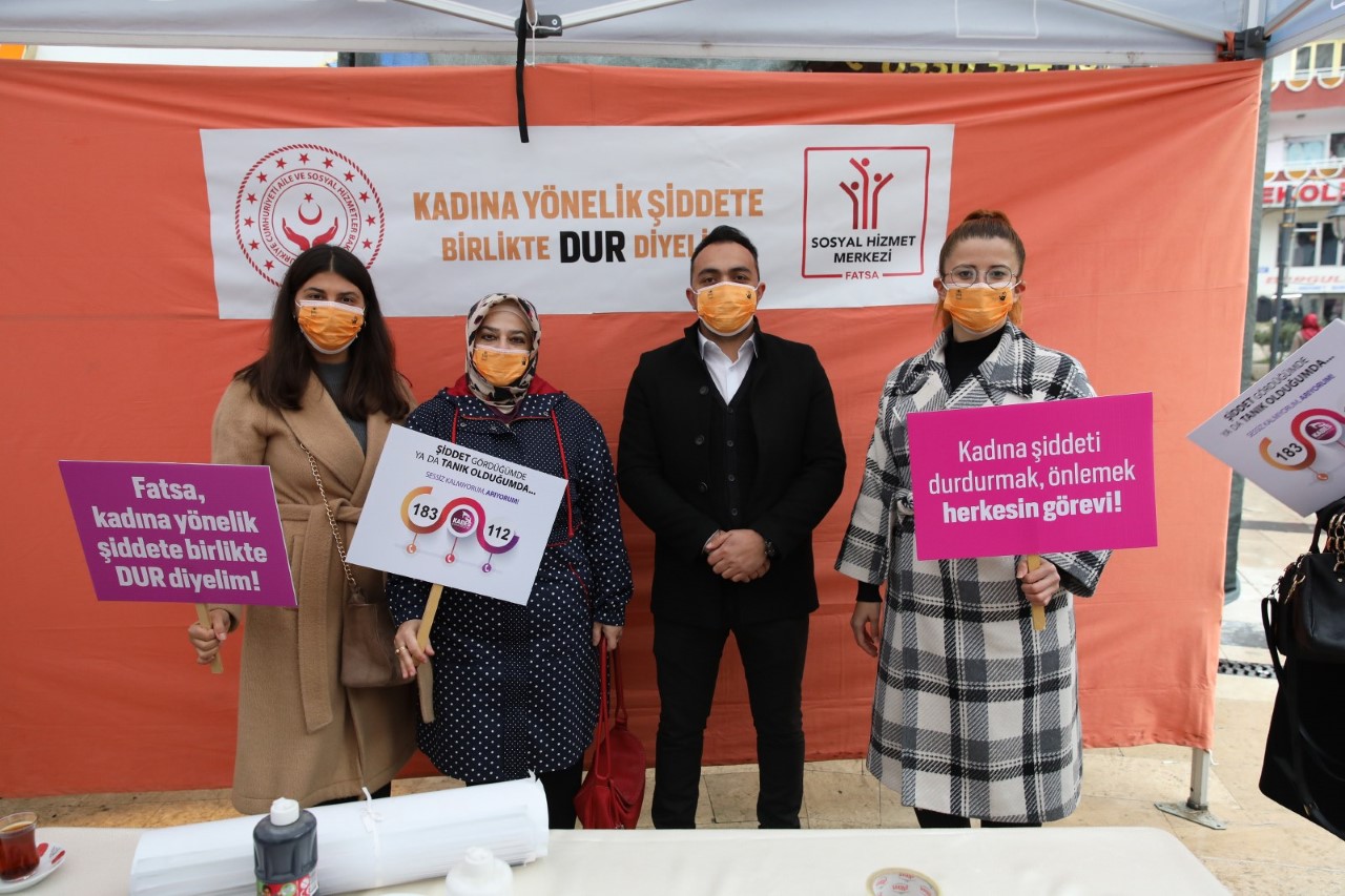 Fatsa Kaymakamlığı Sosyal Hizmet Merkez Müdürlüğü ve Fatsa Belediyesi Sosyal Hizmetler Müdürlüğü işbirliği ile 25 Kasım Kadına Yönelik Şiddetle Mücadele Günü nedeniyle düzenlenen etkinlikte katılımcılar ellerine sürdükleri boyaları platforma sürerek “Şiddete Hayır” dediler.Siyasi parti temsilcileri de birliktelik sağlayarak etkinliğe destek verdiler.Mustafa Kemal Paşa Mahallesi Plevne meydanında gerçekleşen etkinliğe İlçe Kaymakamı Ömer Lütfi yaran İlçe Emniyet Müdürü Sercihan Barutçu, İlçe Jandarma Bölük Komutanı J.Tğm Yusuf Ünsal, Muhtarlar Derneği Başkanı Naci Kızılkaya, siyasi partilerin kadın kolları başkanları ve vatandaşlar katıldı. Fatsa Belediyesi tarafından oluşturulan standda etkinliğe katılan protokol mensupları ve vatandaşlar ellerine boya sürerek platforma “Şiddete Hayır” simgesini sürdüler.