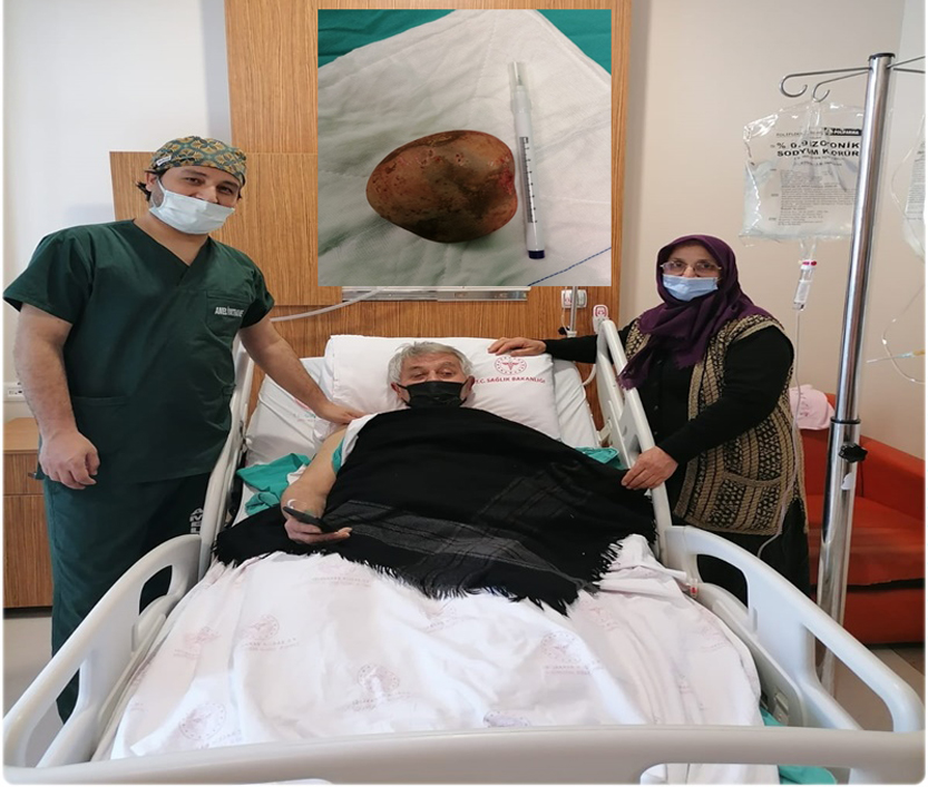 Sürekli idrar yolu enfeksiyonu olan ve dayanılmaz idrar yanması, sık idrara çıkma ve idrar tutmakta zorlanması olan hasta ilaç tedavilerinden fayda görmemesi üzerine Fatsa Devlet Hastanesi üroloji polikliniği de Op. Dr. Yüksel Şahin’e başvurdu ve mesanesinde çok büyük bir taş saptandı. Literatürde bu boyda taş çok nadir görüldüğünden şaşkınlıkla karşılandı ve ameliyat kararı alındı. Kapalı yöntemle çıkarılması mümkün olmadığından açık sistolitotomi ameliyatı ile taş başarılı şekilde alındı.
