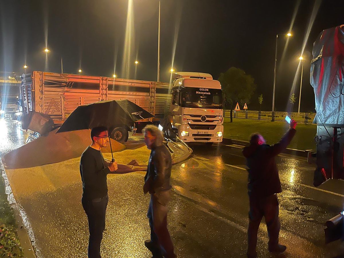 Dolunay kavşağında meydana gelen trafik kazasında tırda yüklü buğday yola döküldü.