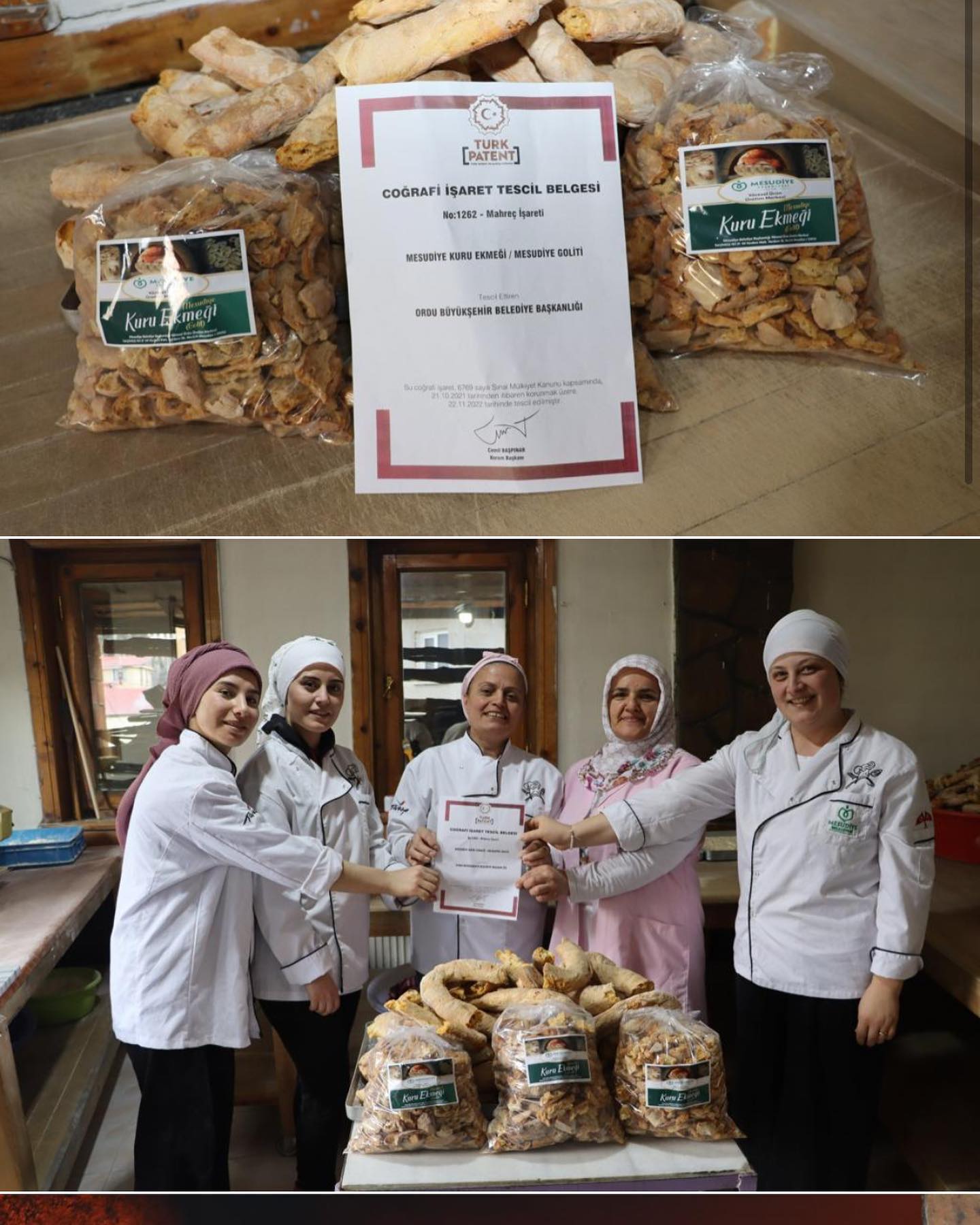 Ordu Büyükşehir Belediyesi, kendine has özellikleriyle kent kültüründe yer edinmiş ürünleri şehrin gastronomisine kazandırmak amacıyla başlattığı çalışmalarına bir yenisini daha ekledi. Bu kapsamda Büyükşehir Belediyesi Tarım ve Hayvancılık Hizmetleri Dairesi Başkanlığı ve Mesudiye Belediyesi’nin girişimleriyle, Mesudiye Kuru Ekmeği-Mesudiye Goliti Türk Patent ve Marka Kurumunun 1 Aralık 2022 tarihli Resmi Coğrafi İşaret ve Geleneksel Ürün Adı Bülteni’nde yayımlanarak mahreç işaretli ürün olarak tescillendi.