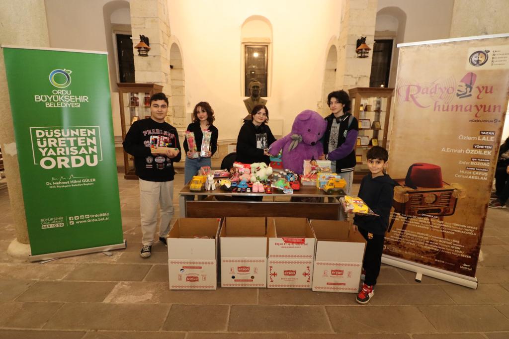 Ordu Büyükşehir Belediyesi Karadeniz Tiyatrosu’nda sahnelenen Radyo-yu Hümayun oyunu öncesi oyuncaklar toplandı. Oyuna yetişkinlerin yanı sıra çok sayıda çocuk ve genç oyuncakları ile katıldı. Kimi çocuk yeni aldığı kimileri ise en sevdiği oyuncağını getirdi. Oyunda ayrıca perdeler açılır açılmaz seyirciler tarafından sahneye oyuncaklar atıldı.